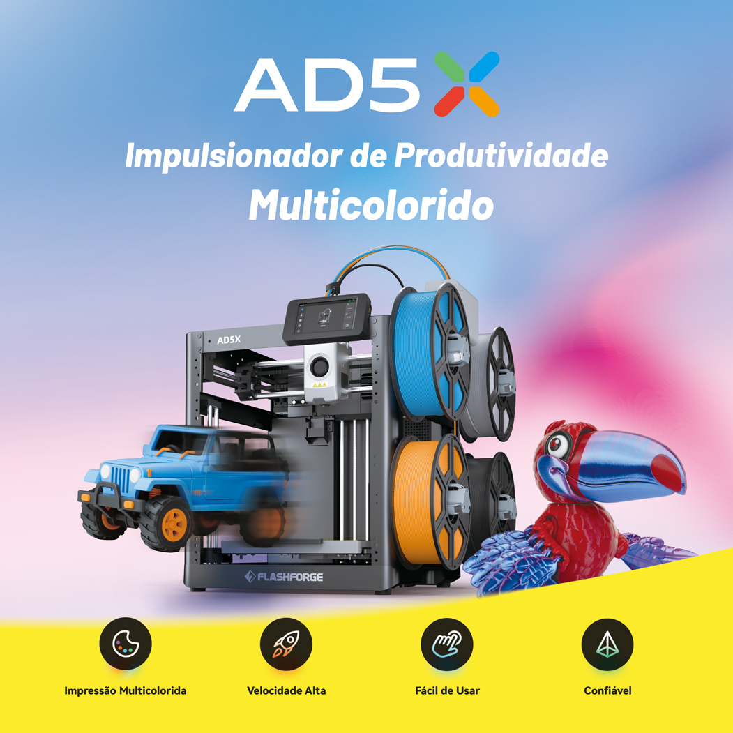 A Flashforge AD5X é a impressora 3D multicolorida que eleva sua produtividade e criatividade. Com sistema de impressão precisa e suporte a múltiplos filamentos, permite criar peças detalhadas, coloridas e de alto impacto visual. Ideal para makers, designers e empresas que buscam resultados profissionais com qualidade superior.